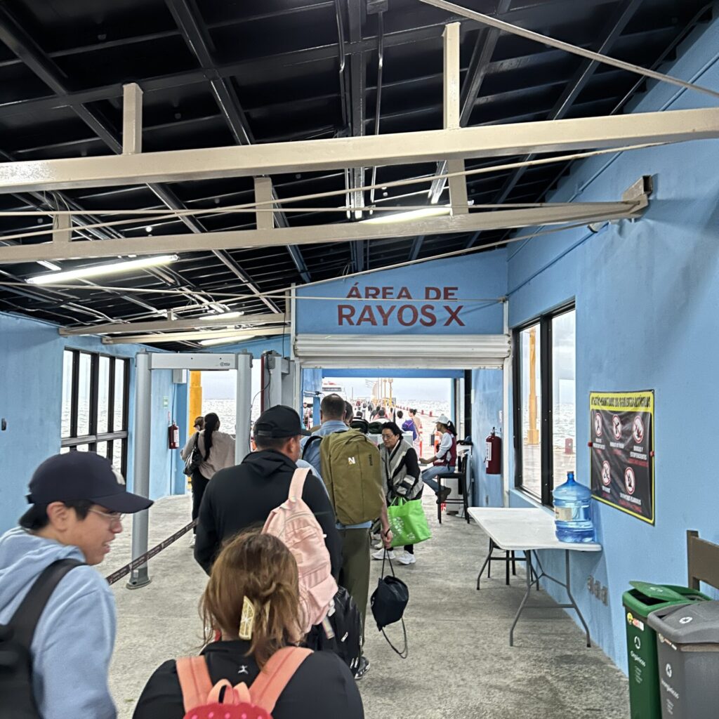去年からフェリー乗り場の桟橋に小さな屋根ができて、「何になるんだろうな〜」と思っていたら、前々からチケット提出をする列の手前にあった手荷物検査場が移動していました!