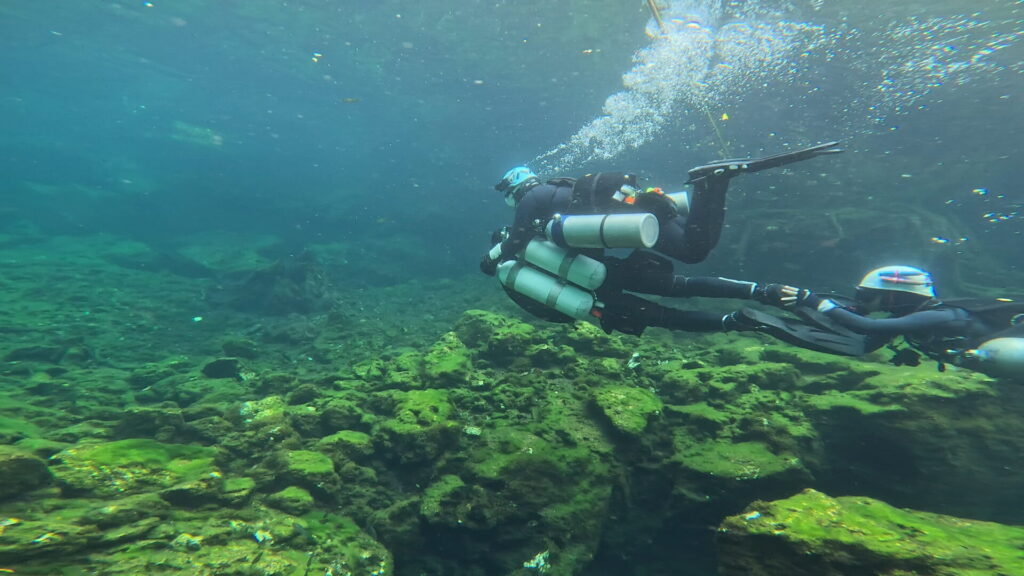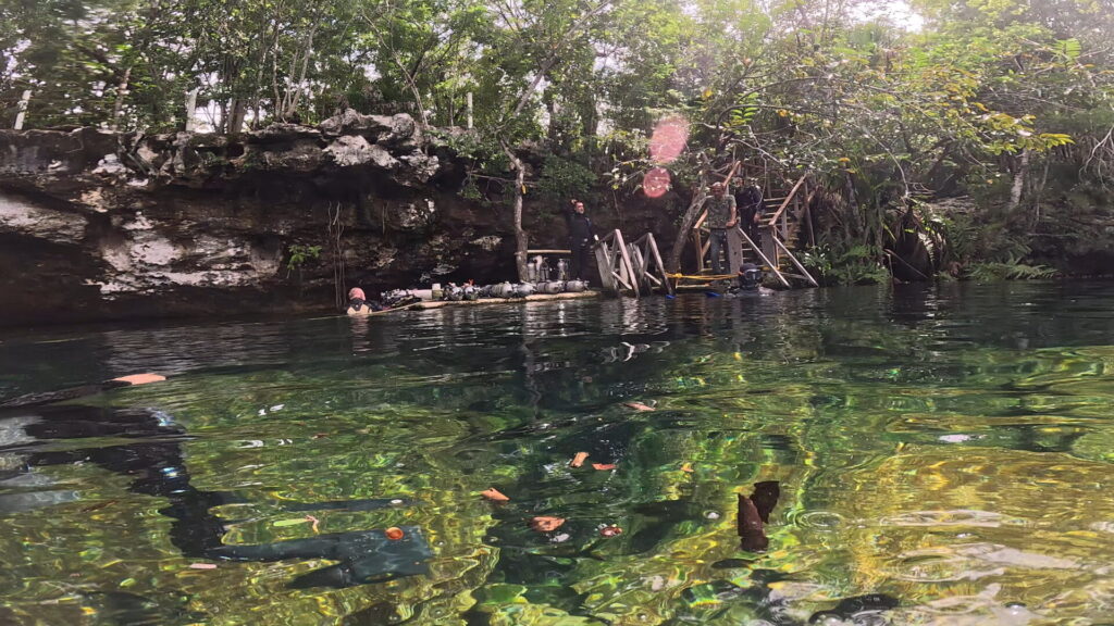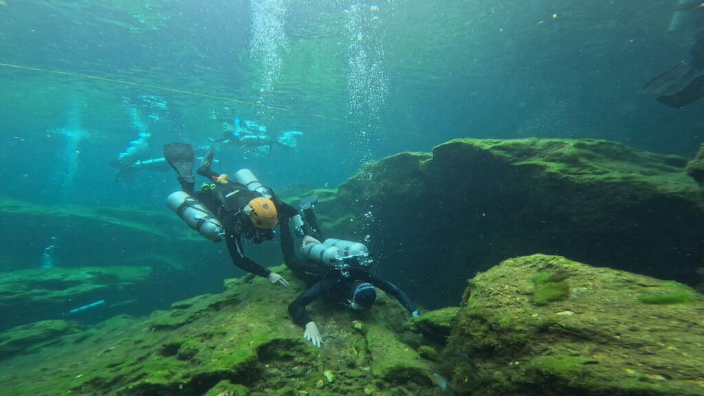 実際にセノーテに入り、グループに分かれてスキルの復習と実践練習を行いました。