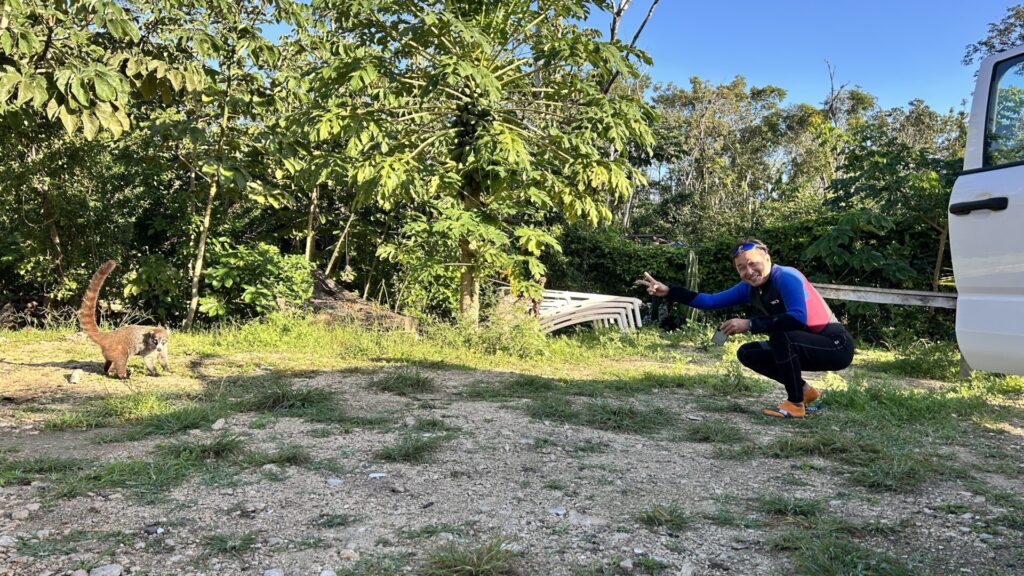 ダイビング前には、なんと最近よく見かけるオスのハナアナグマもちょろちょろ。